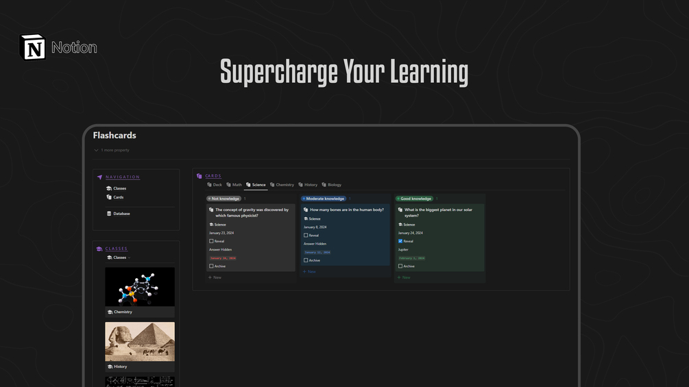 🚀 Seamless Organization: Say goodbye to scattered notes and hello to organized studying! Our template empowers you to create and manage flashcards for all your subjects in one convenient place. Keep track of your progress and review your learning materials effortlessly.