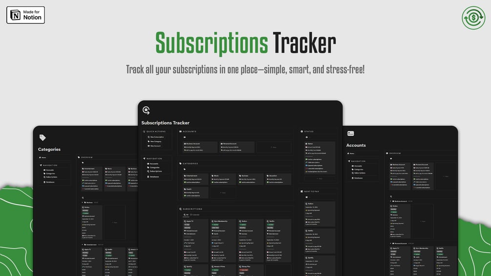 Stay on top of your recurring payments, and never miss a subscription renewal again. The Subscriptions Tracker gives you a simple, clutter-free solution to manage all your subscriptions in one place.
