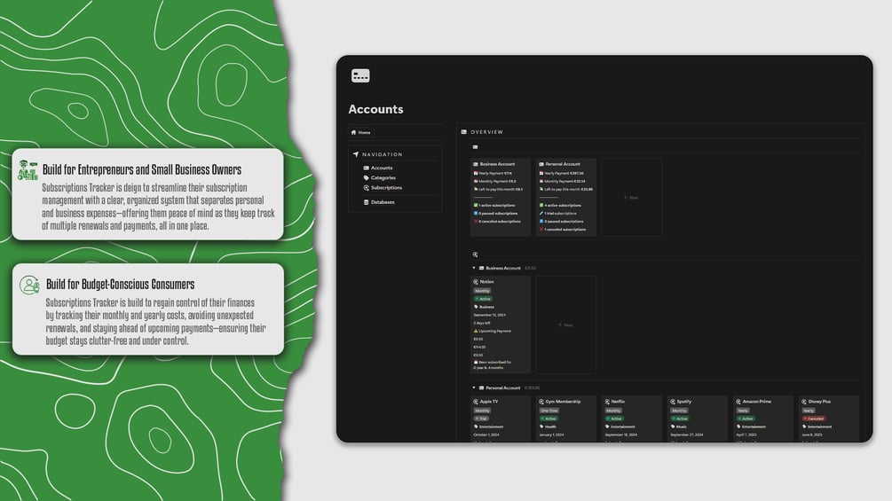 - For Entrepreneurs and Small Business Owners, they streamline their subscription management effortlessly. With a system that separates personal and business expenses, they can stay on top of multiple renewals and payments without the hassle—everything they need is organized in one place, clutter-free.