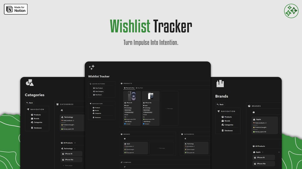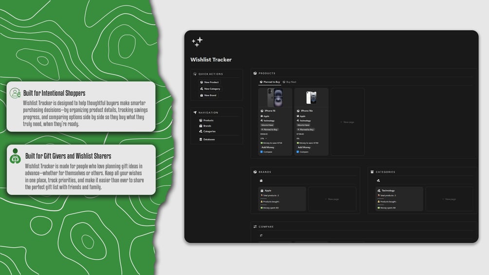 🆓 Free Version: Includes the full wishlist dashboard, product database, quick actions, and brand/category overviews—perfect for anyone who wants to get started with intentional shopping right away.