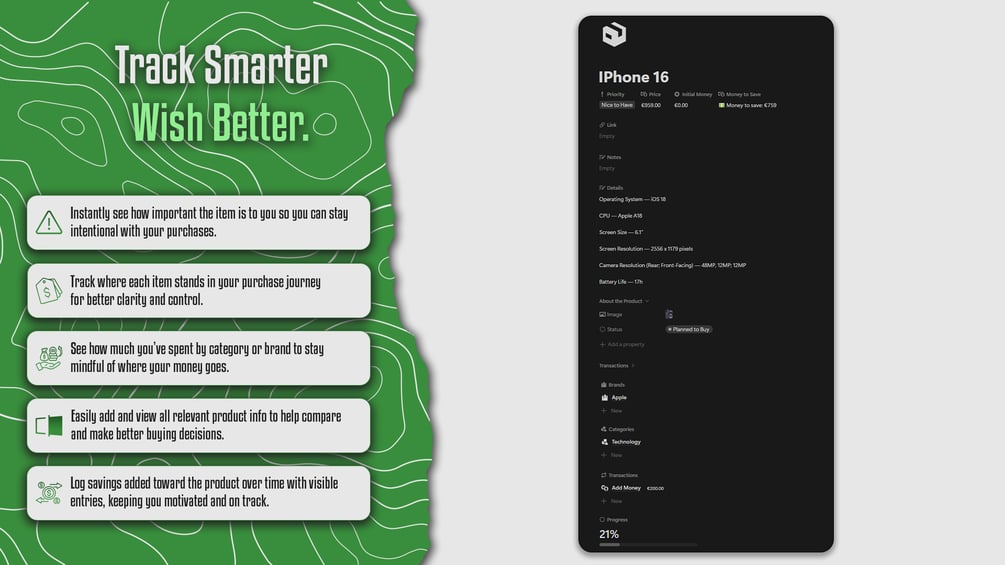 Take control of your spending, track what you truly want, and make smarter buying decisions with the Ultimate Wishlist Tracker Template—built in Notion.